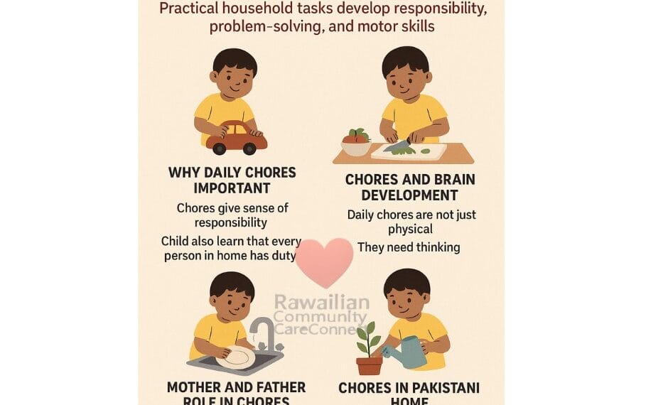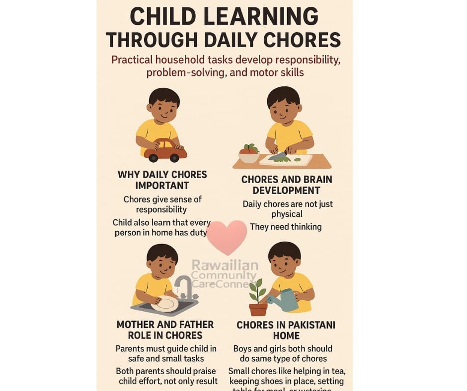 Early childhood is not only about books and toys. Small daily chores in home also become strong way of learning. When child help in house work, he feel important, he learn skill, and he also get discipline. Parents sometimes think chores are heavy for child, but if given in small simple way, they are very good for brain and body.