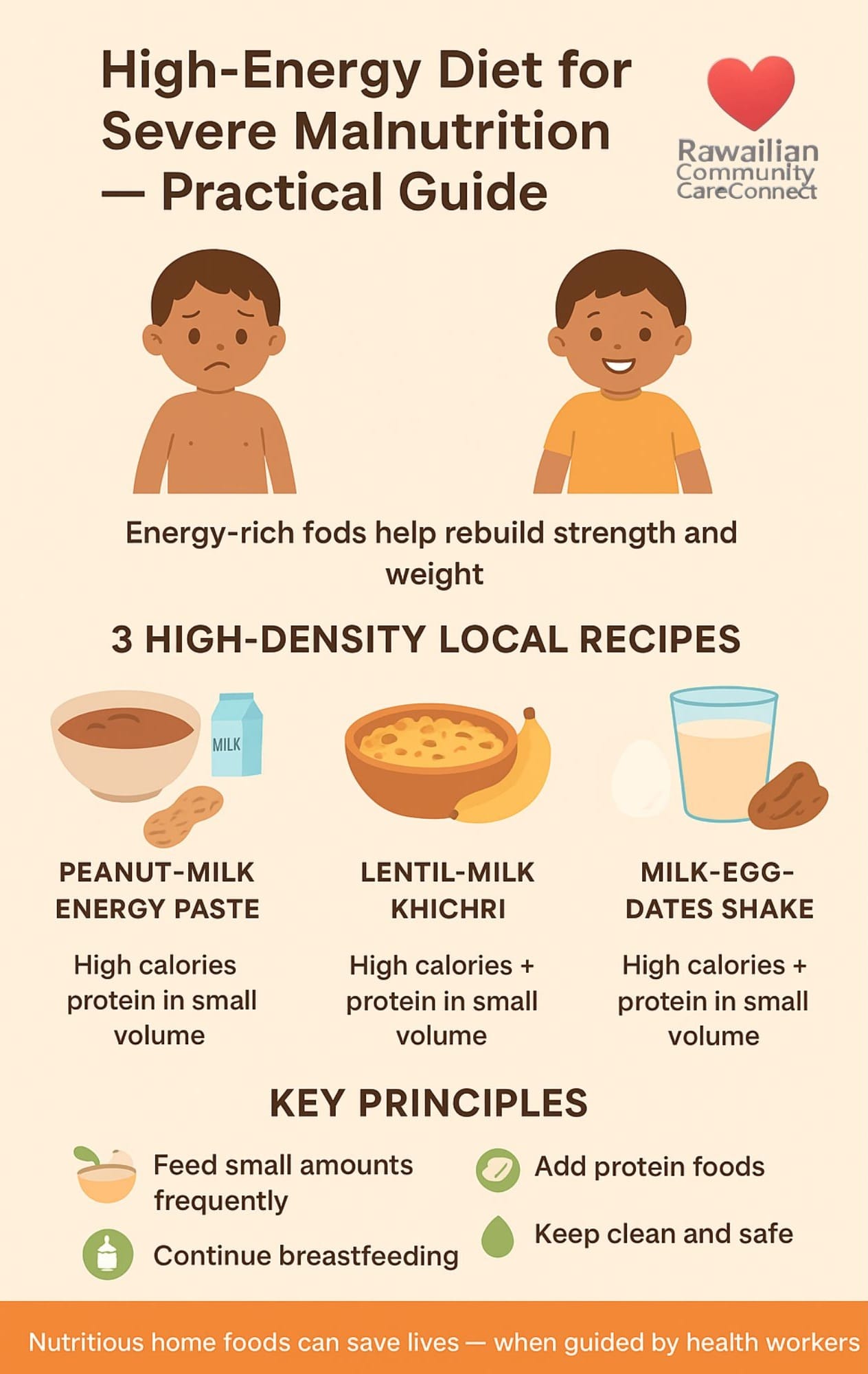 Home high-energy recipes are not replacement for RUTF or hospital feeds in complicated SAM. Use them only under guidance of local health staff or when RUTF is not immediately available and health worker advises. UNICEF+1