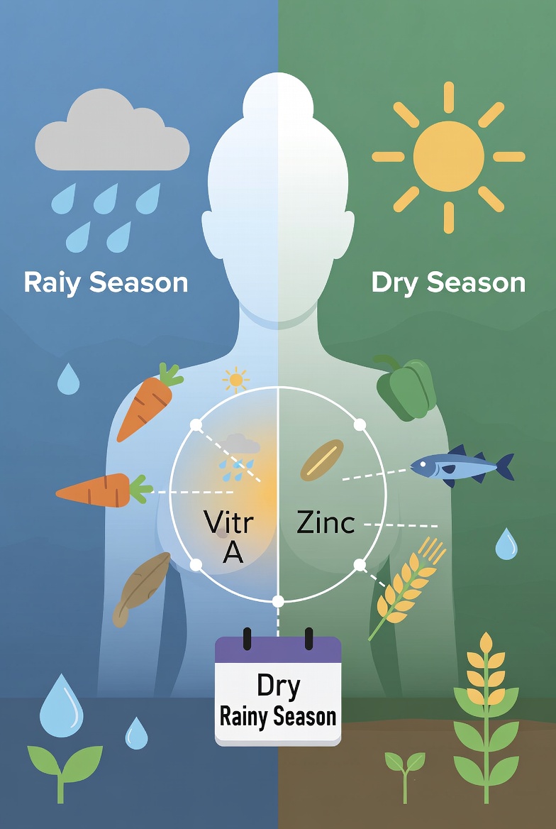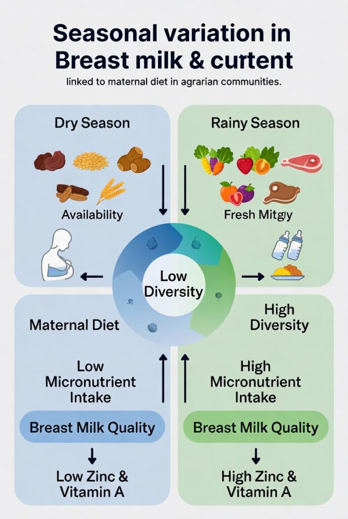 But the dry season tells a different story. When rain stops, fields dry up, and food becomes scarce. People might rely on stored grains like rice or millet, which are filling but low in variety. Fresh veggies and fruits disappear, and animal products like meat or dairy might be rare due to cost or availability. This leads to “low dietary diversity”—basically, eating the same boring stuff every day. Moms’ bodies can’t get enough zinc from things like seeds or beans if they’re not around, or vitamin A from colorful veggies. Research from areas like Malawi highlights how breast milk zinc drops by up to 20-30% in dry periods, and vitamin A can fall short too. This isn’t because moms aren’t trying; it’s the environment limiting options.